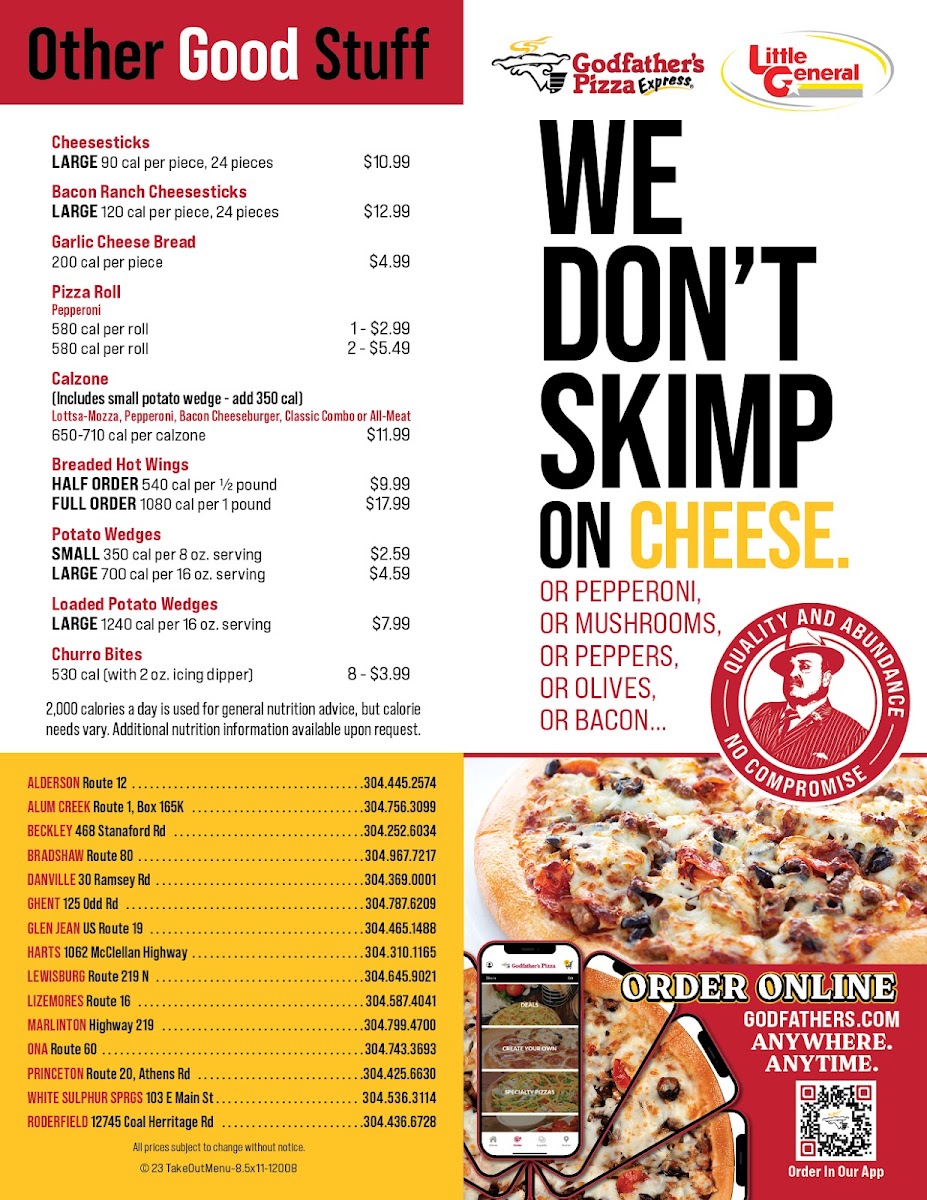 Don't overlook the appetizers: their tender bone-in wings, coated in your choice of sauces, pair perfectly with a variety of sides. And for a sweet finish, the Churro Bites, sprinkled in cinnamon sugar and served with creamy icing, are an irresistible treat at only $3.99. Customers praise the food quality, service, and cleanliness, making Godfather's Pizza a must-visit destination in West Virginia. Experience their exceptional offerings that will keep you coming back for more!